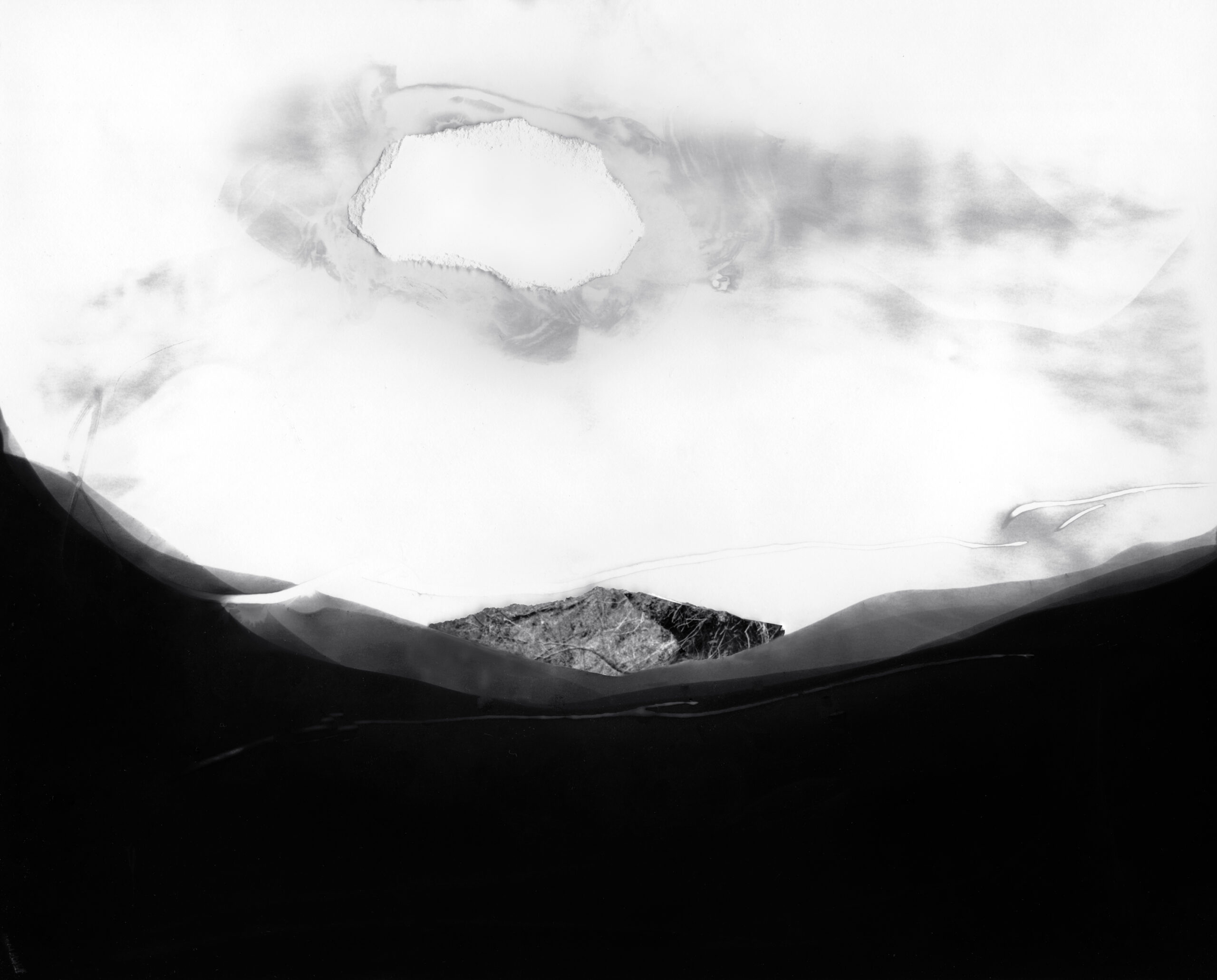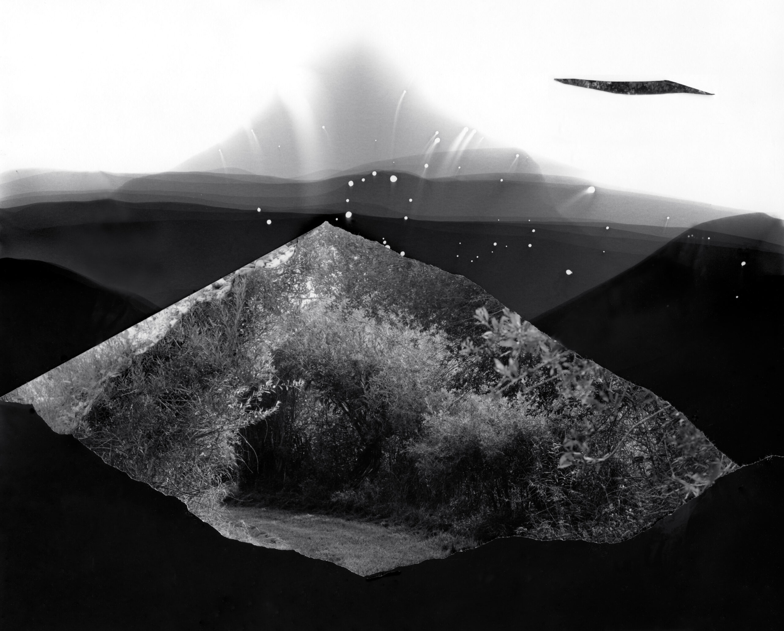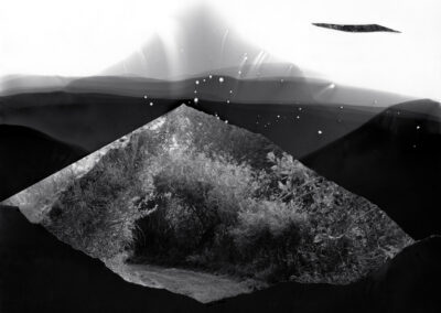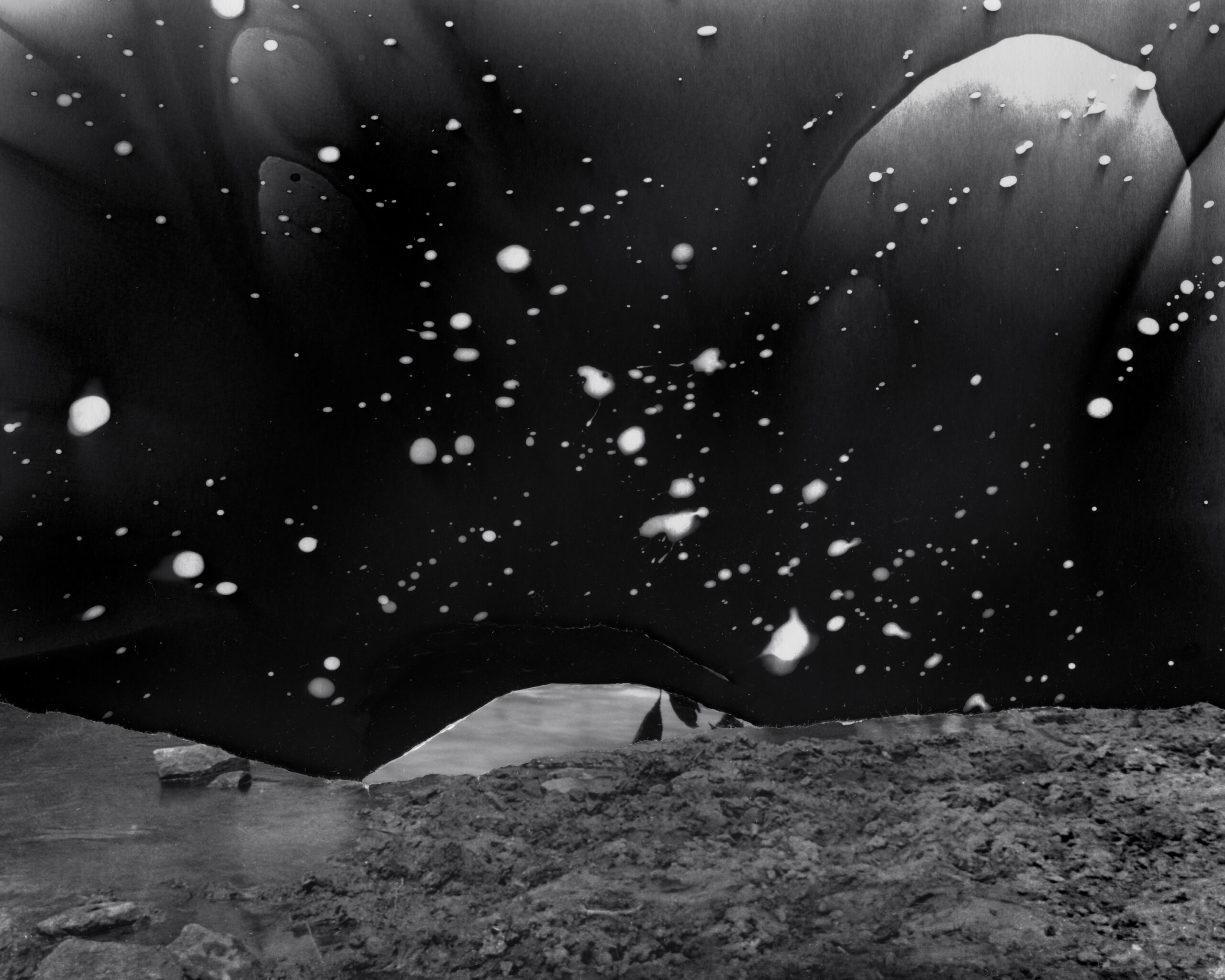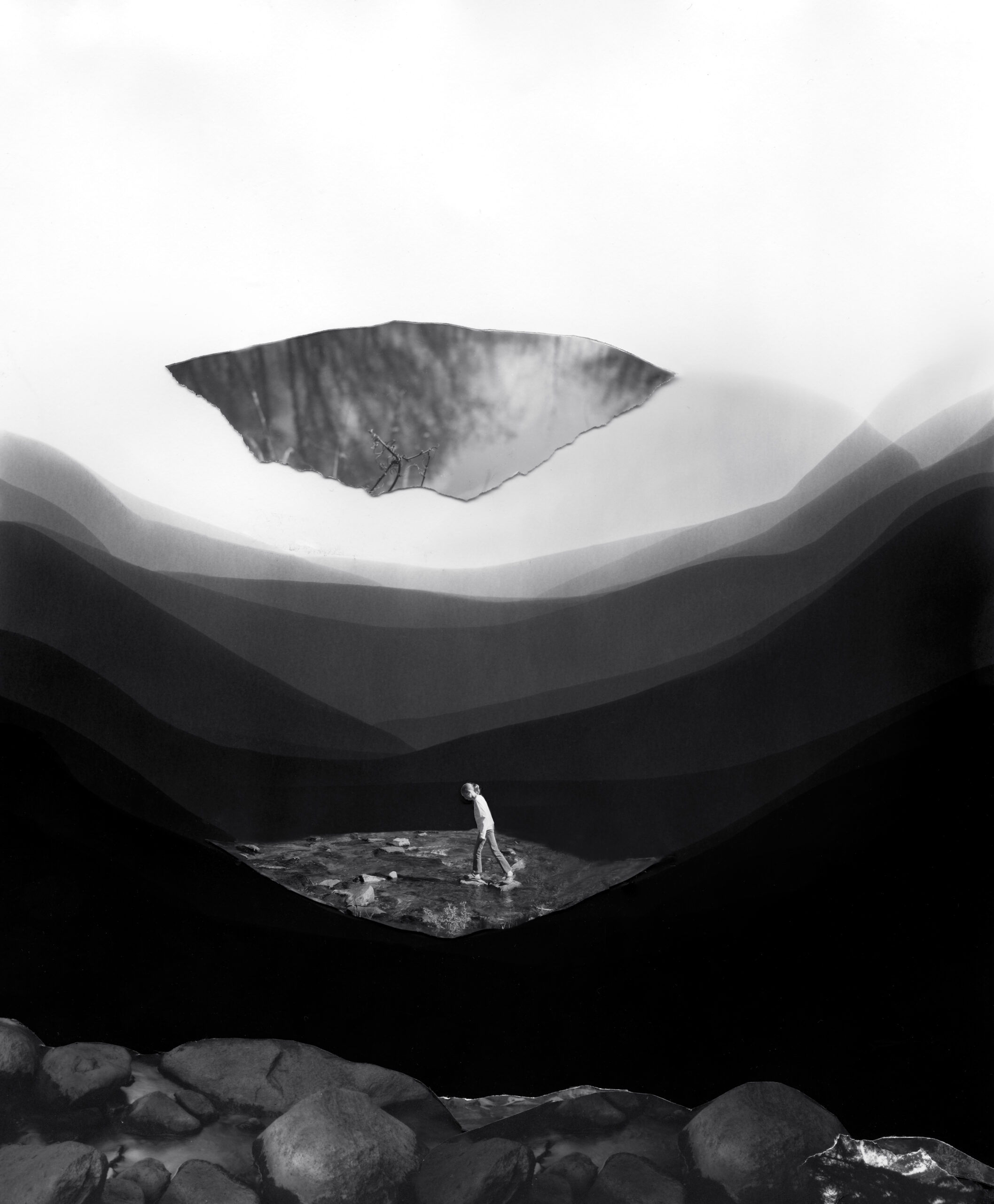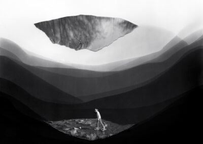 My fictional and fragmented images, made from camera-less chemigrams and collaged snippets from my own photographs, attempt to slice through history, space, galaxies, and reconfigure our understanding of our position in the world as both precarious and hopeful. This ancient rock on which we reside offers a context for reveling in uncertainty and peering into the vastness of incomprehensible things. I am a skeptic but I search for the sacred, somehow attached to the ancient and adjacent to the wisdom of the natural world. The rocks, skies, caverns, and stars offer limitless possibility for wandering among the unknown and clasping the occasional slippery fragment of sacred, ancient knowledge. How will we retain fragile hope in a world spinning an orbit of waste and confusion? How do we navigate the unknown with respect and care instead of destruction? These images explore the precarity and insignificance of our existence while promoting the spirit of our imaginations and insistent hope.