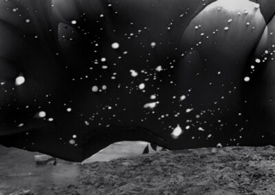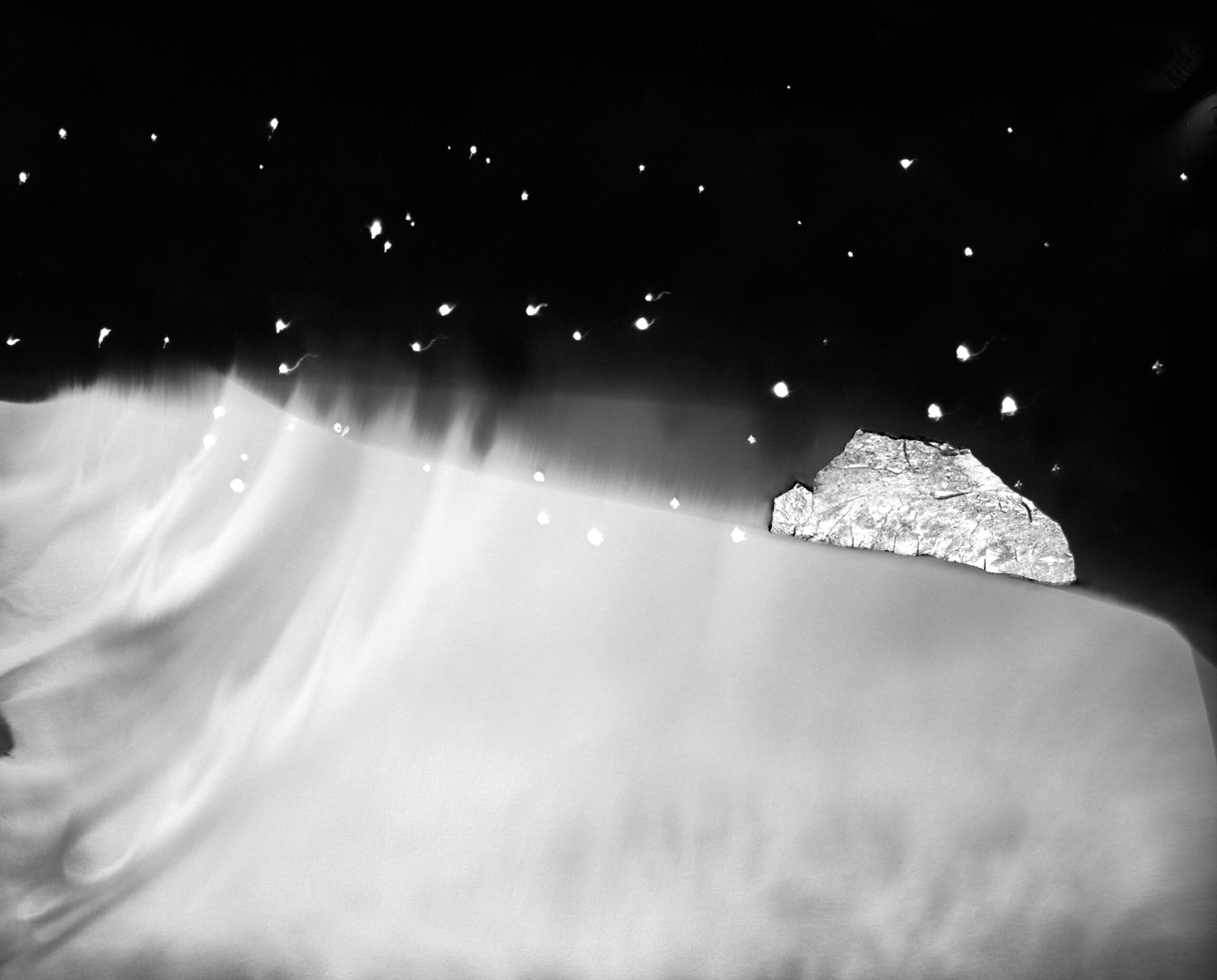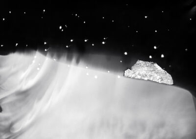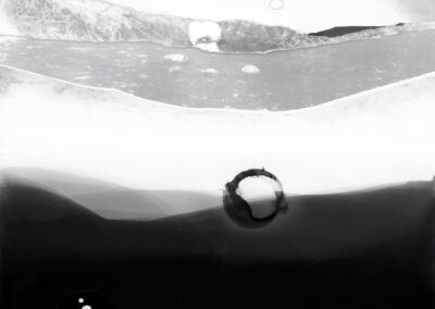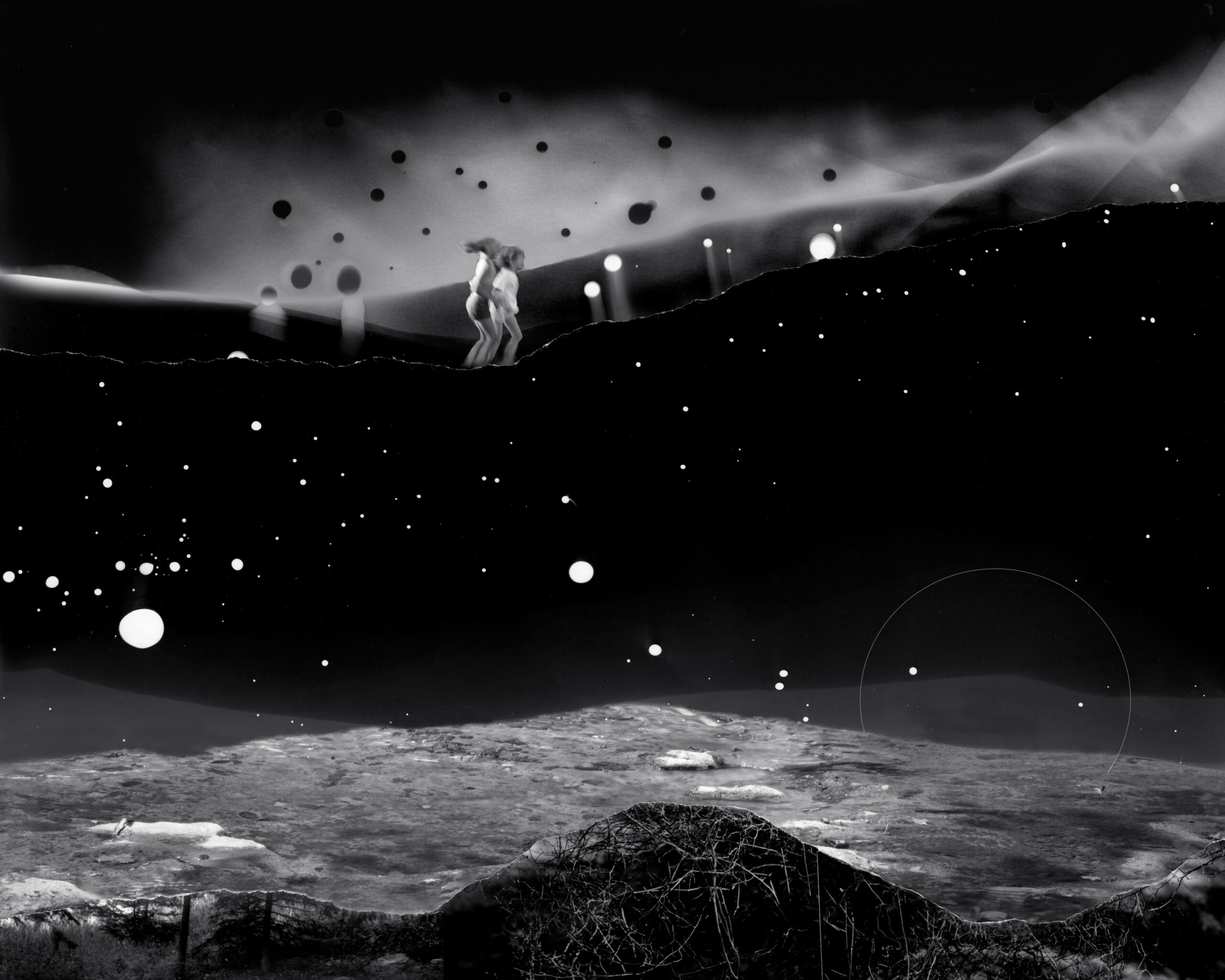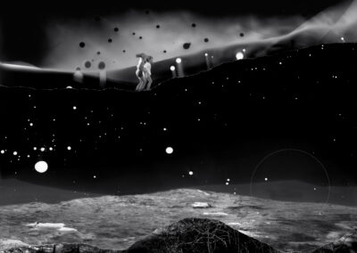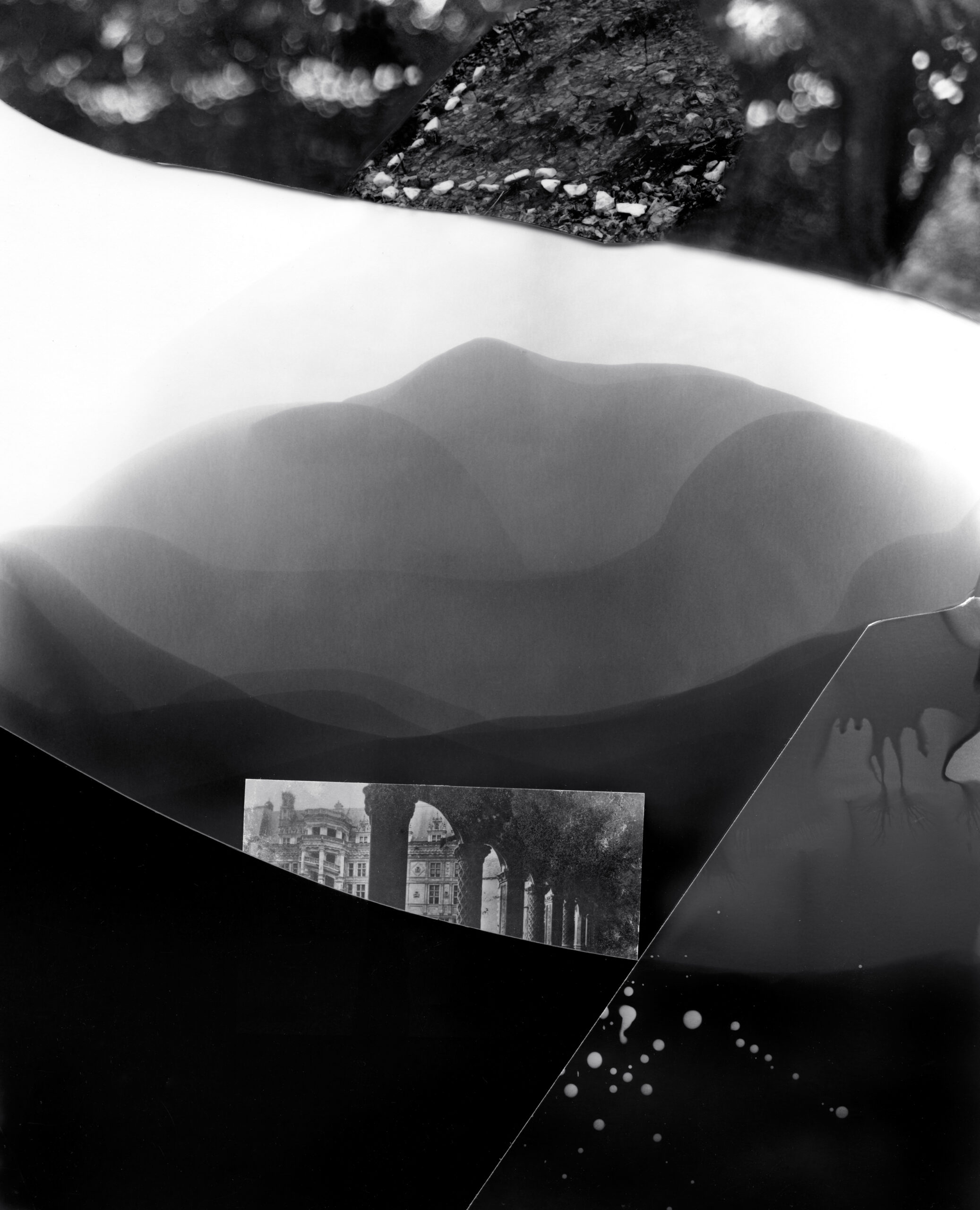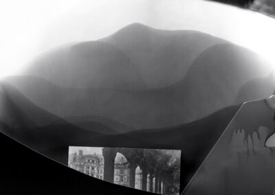 My fictional and fragmented images, made from camera-less chemigrams and collaged snippets from my own photographs, attempt to slice through history, space, galaxies, and reconfigure our understanding of our position in the world as both precarious and hopeful. This ancient rock on which we reside offers a context for reveling in uncertainty and peering into the vastness of incomprehensible things. I am a skeptic but I search for the sacred, somehow attached to the ancient and adjacent to the wisdom of the natural world. The rocks, skies, caverns, and stars offer limitless possibility for wandering among the unknown and clasping the occasional slippery fragment of sacred, ancient knowledge. How will we retain fragile hope in a world spinning an orbit of waste and confusion? How do we navigate the unknown with respect and care instead of destruction? These images explore the precarity and insignificance of our existence while promoting the spirit of our imaginations and insistent hope.